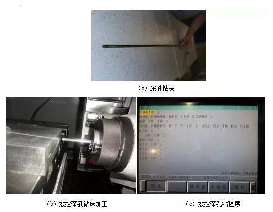 數(shù)控深孔鉆床使用(見(jiàn)圖4),經(jīng)過(guò)反復(fù)試驗(yàn),1個(gè)深孔加工動(dòng)作宜采用“三級(jí)加工法”:定位鉆削、導(dǎo)向鉆削及正常鉆削,稱(chēng)為“三級(jí)鉆孔技術(shù)”。三級(jí)鉆孔需要根據(jù)不同的鉆孔深度采用不同的切削速度,目前機(jī)床自帶的數(shù)控鉆孔指令只能完成1個(gè)鉆孔深度和1個(gè)切削速度,如何使用常用的鉆孔指令來(lái)實(shí)現(xiàn)三級(jí)鉆孔可分兩種方法:①手動(dòng)干預(yù):根據(jù)不同的鉆孔深度,人為的手動(dòng)來(lái)進(jìn)行調(diào)節(jié)切削速度。②重復(fù)進(jìn)給:對(duì)同一個(gè)孔分別進(jìn)行編制3個(gè)鉆孔程序,指令不同的鉆孔深度和切削速度,進(jìn)行重復(fù)操作。