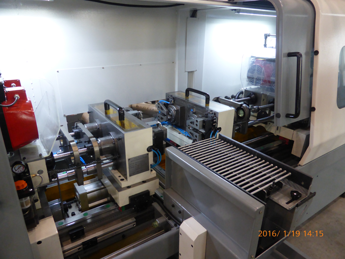為了降低操作者勞動強度,該機床配置了自動上下料機構。該機構數控控制,一次安裝28支工件。送入加工區(qū)域后,機床會自動依次加工,直至完成所有28支工件的加工。送料架再退出加工區(qū),由人工將成品取走。