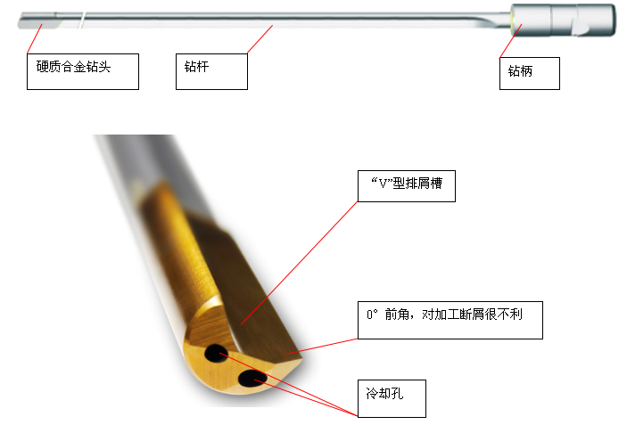 通常槍鉆都是采用釬焊式的制造工藝,一般由鉆柄、鉆桿、鉆頭三部分焊接在一起。槍鉆中間有一通孔,是切削液進入切削區(qū)的通道。
