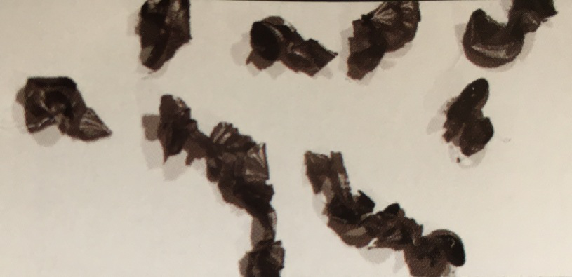 整體焊接式槍鉆加工鐵屑形狀見下圖,長度均較長,容易堵屑、纏屑。